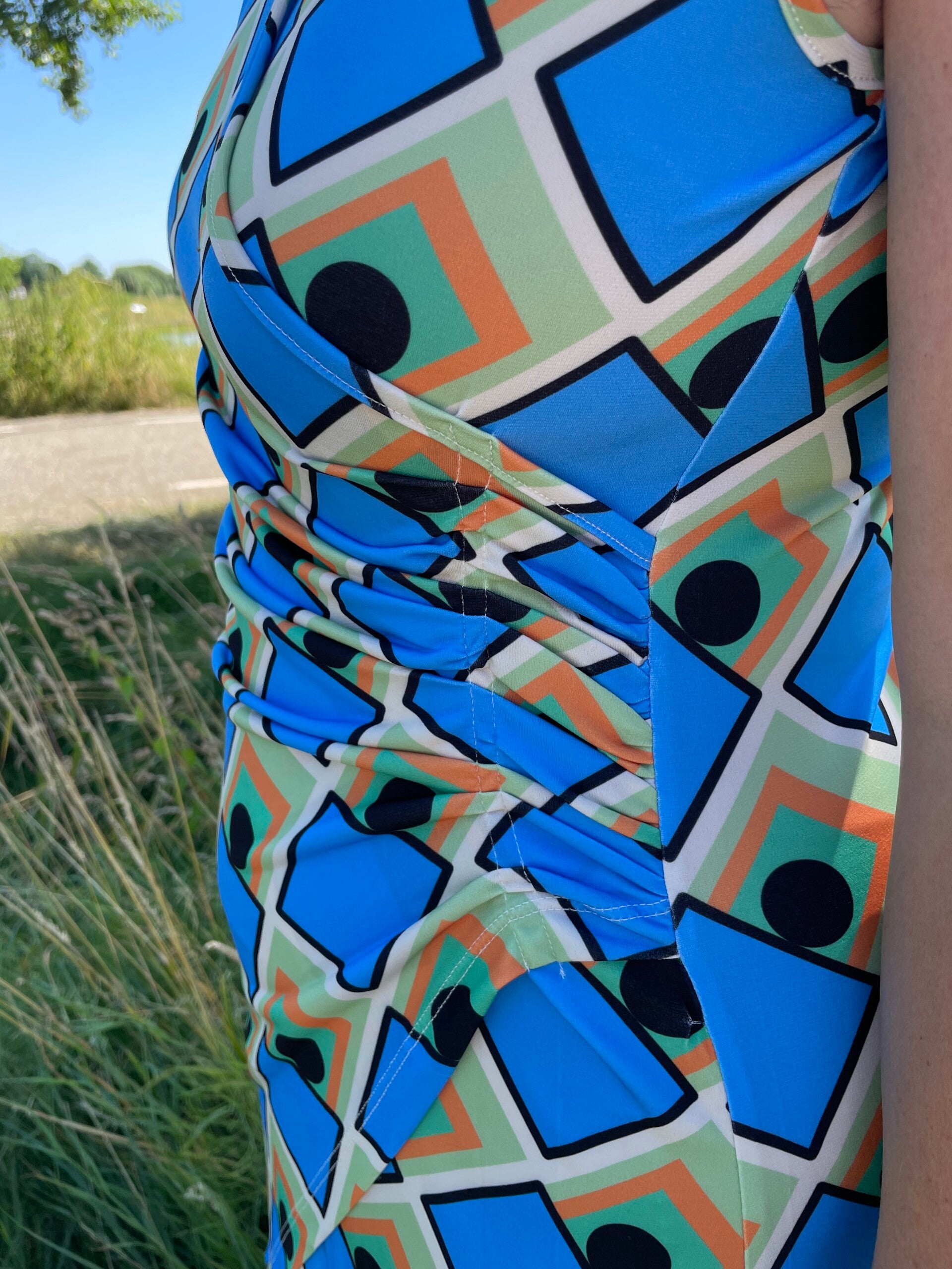 Jurk in overslag model met rimpel effect in de taille is gemaakt in een kreukvrije traveller kwaliteit van Angelle Milan.