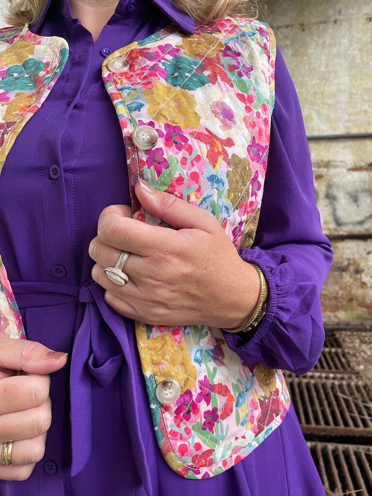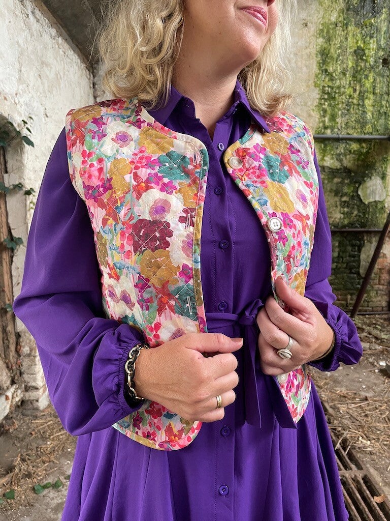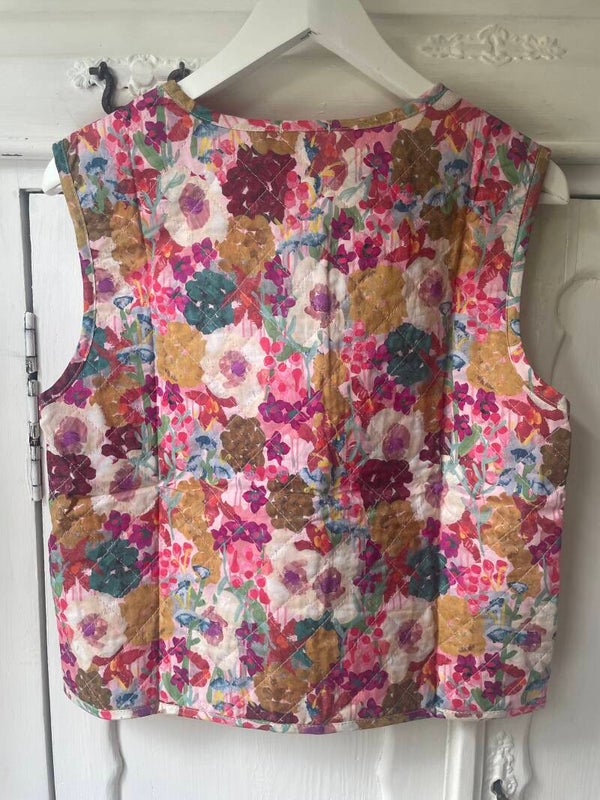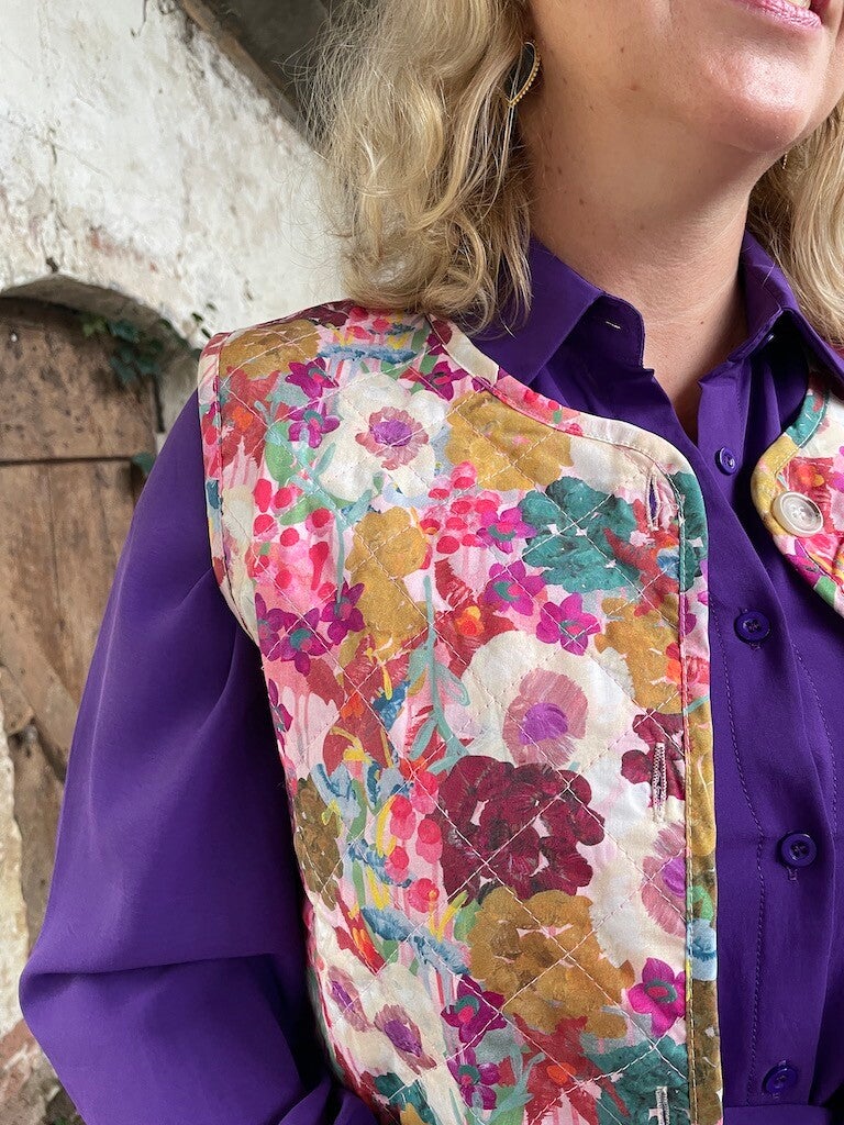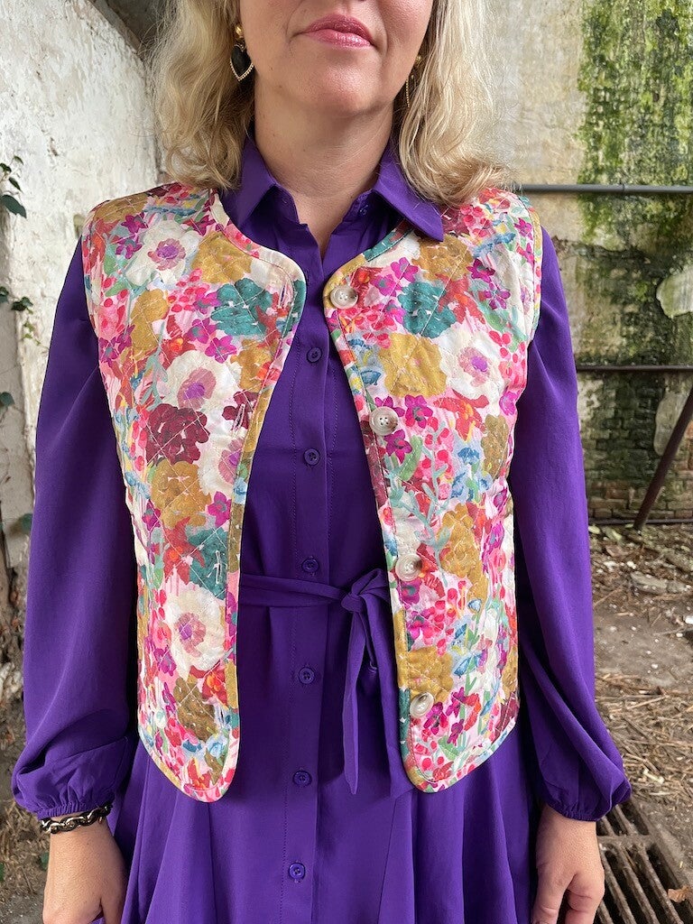 Doorgestikt gilet in multicolor bloemen print. Door de vele kleuren in het gilet, is het eenvoudig te combineren.