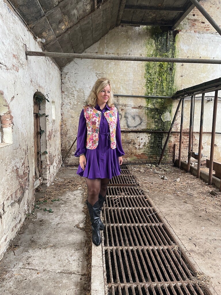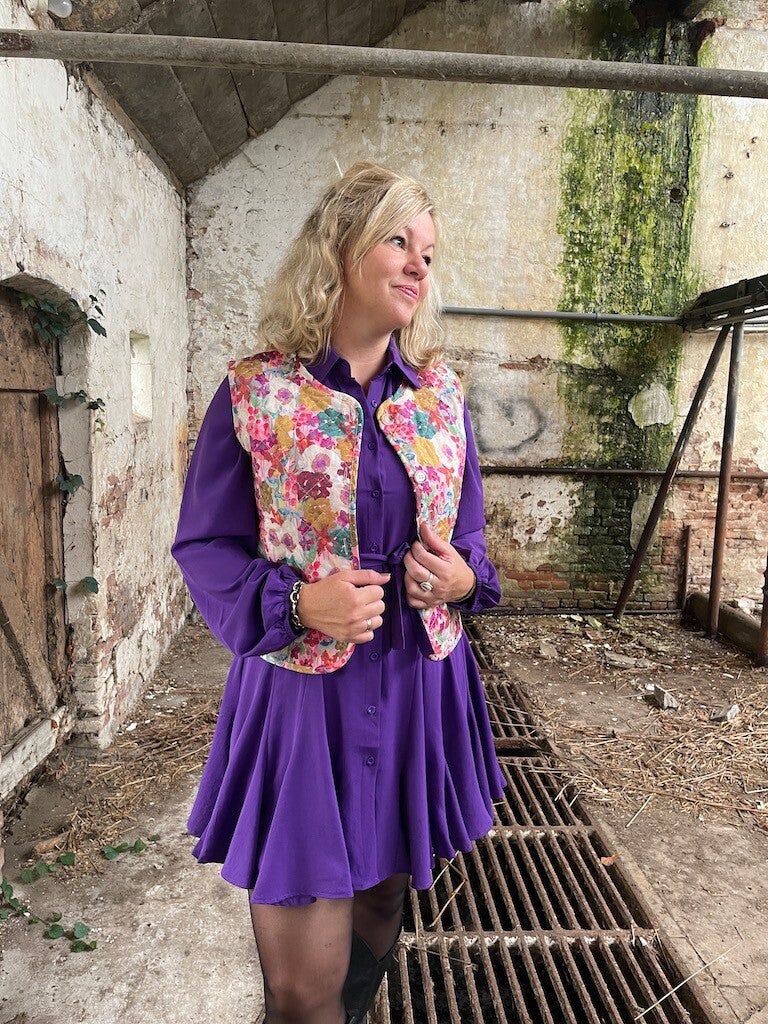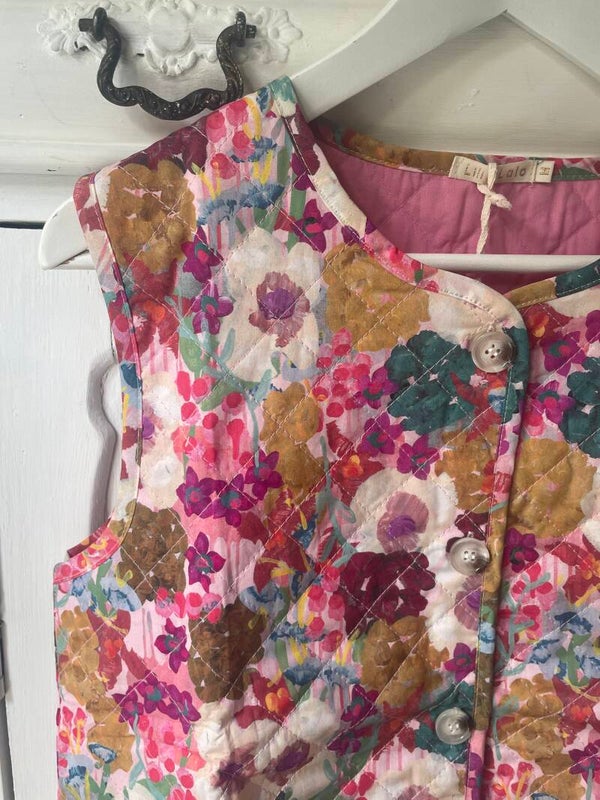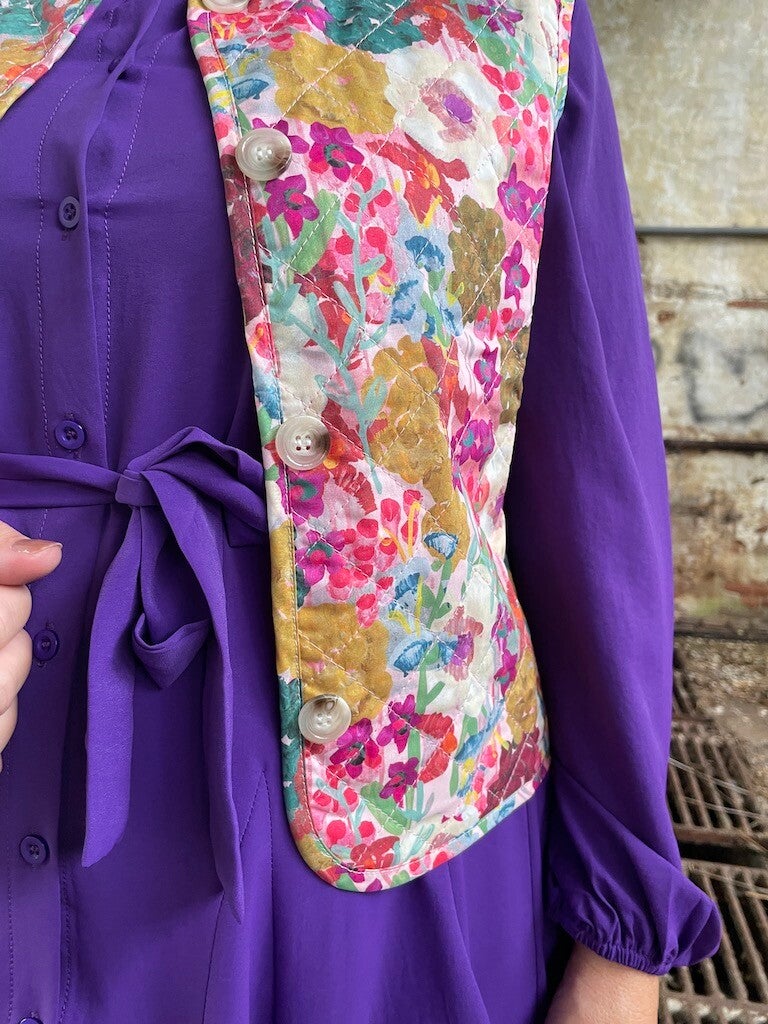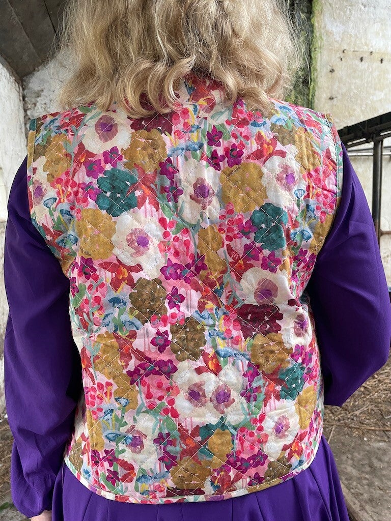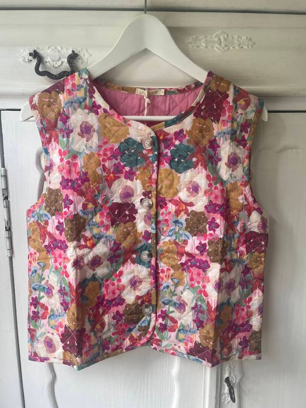 Doorgestikt gilet in multicolor bloemen print. Door de vele kleuren in het gilet, is het eenvoudig te combineren.