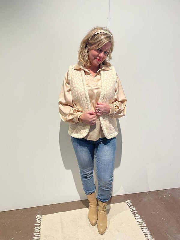 Trendy gilet met een lichte kleur teddy stof aan de binnenkant. En een leuke printstof aan de buitenkant. En wat nu zo leuk is bij dit gilet, het gilet is aan beide zijde te dragen!!