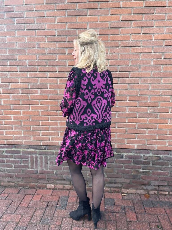 Gilet met printje, en zwarte teddy stof als afwerkrand.