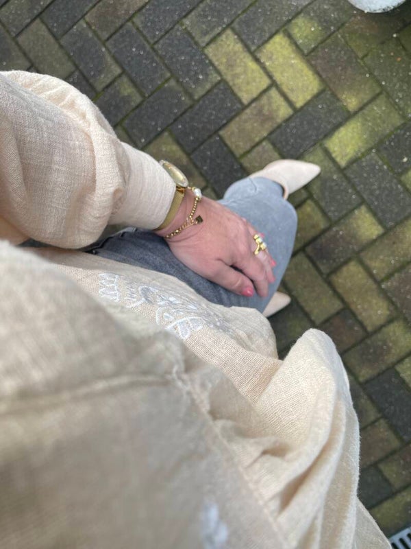 Leuke linnen look blouse met witte borduursels, en een v-hals.