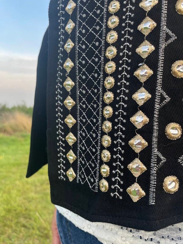 Zwart gilet in dikke katoenen stof, met op het voorpand mooie versierseltjes. en op de achterzijde is het gilet egaal.