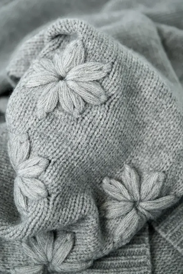 Onderaan de mouwen zitten indezelfde kleur grijze bloemen op verwerkt.