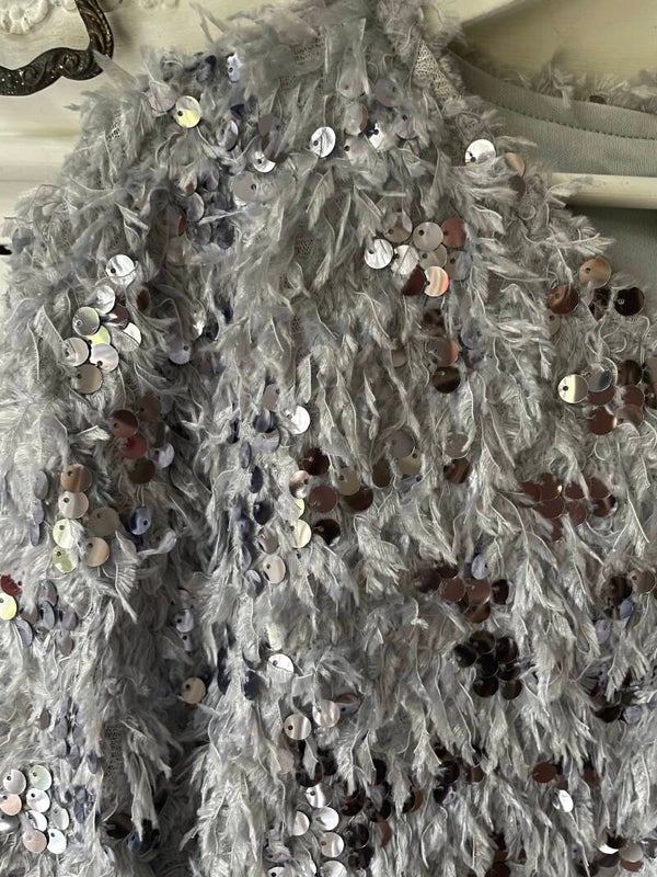 Deze top kan zowel feestelijk als casual op een jeansrok of broek gedragen worden. Over de pluizige top zijn pailletten verdeeld.
