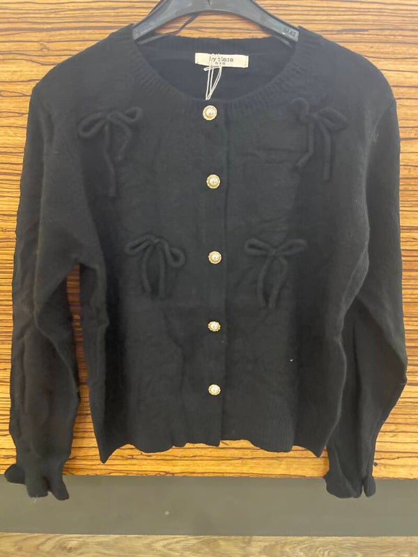 Zwart vest met extra details! Leuke strikjes op het voorpand, en sierlijke knoopjes, ook het boord dat langs de mouwen zit geeft wat extra's door het roes effect.