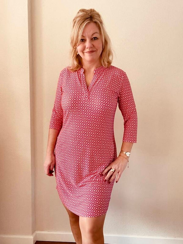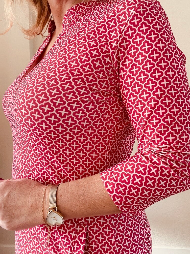 Draagt comfortabel met de zomerdag en kreukt niet, er zijn diverse printjes en kleuren verkrijgbaar van dit model: Jurk Angelle Milan Travelstof 1467 Emma - Roze, wit en Jurk Angelle Milan 1467 Emma - Rood
