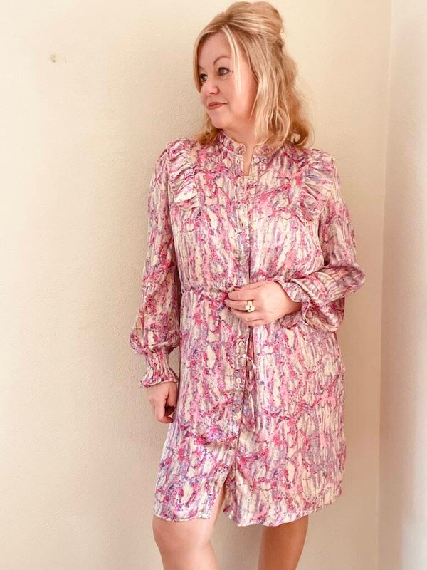 Jurkje in roze/paars tinten, met ingeregen koordje om taille te creëren. Het jurkje is gemaakt van een dunne soepele stof, en heeft voering waardoor het mooi valt.