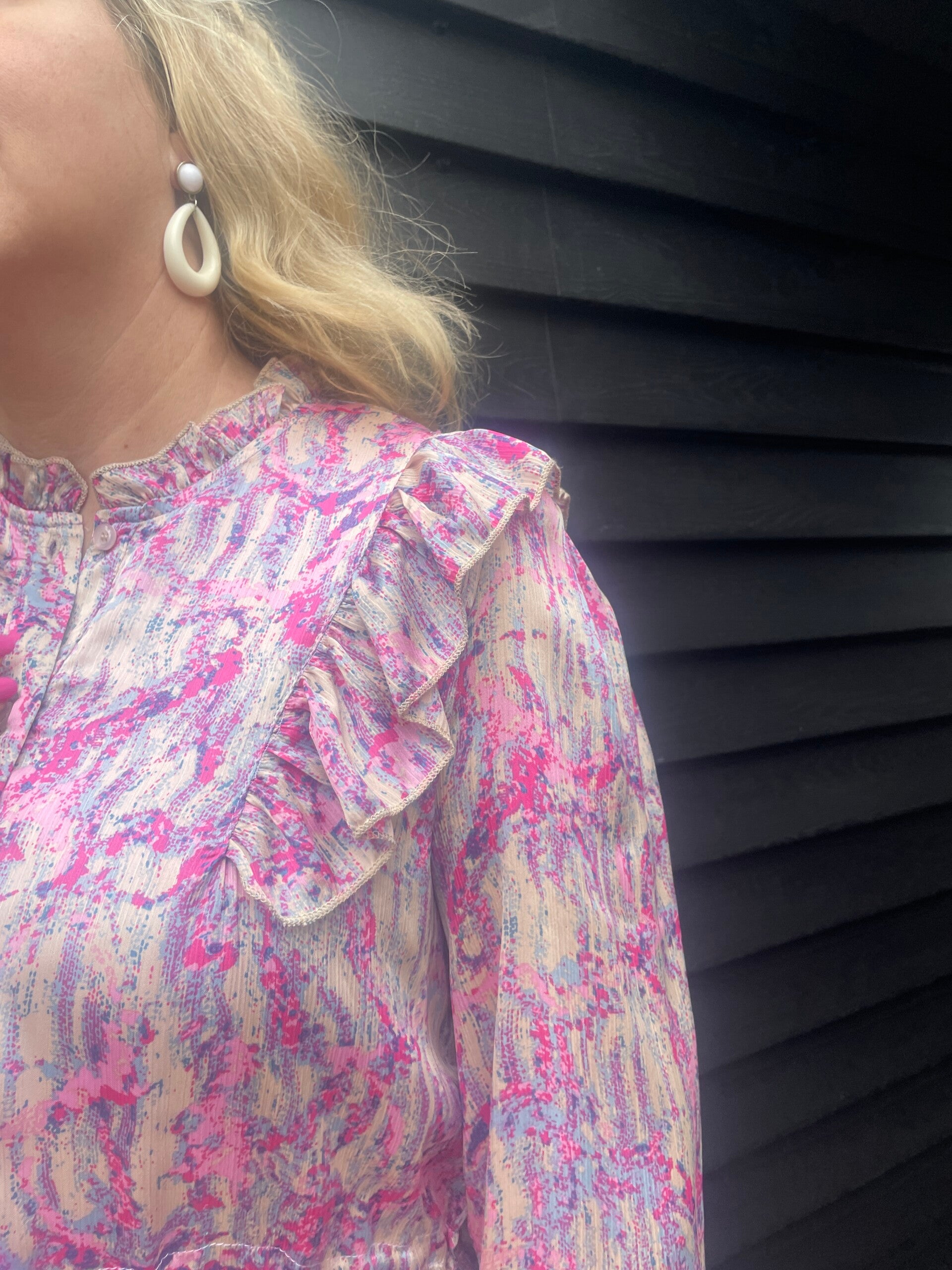 Deze Azzurro jurk valt op door de unieke print en elegante lange mouwen. Licht, comfortabel en vrouwelijk een jurk die je garderobe meteen bijzonder maakt.