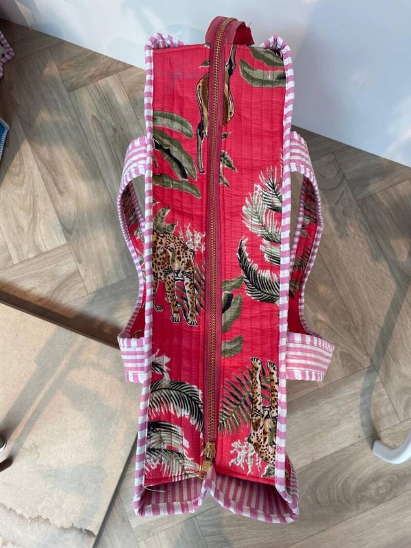 Superleuke tas met panterprint, gecombineerd met een streep stof. De tas sluit d.m.v. een rits, en de tas heeft aan de binnenzijde een kleine vakje voor bijvoorbeeld je sleutels.