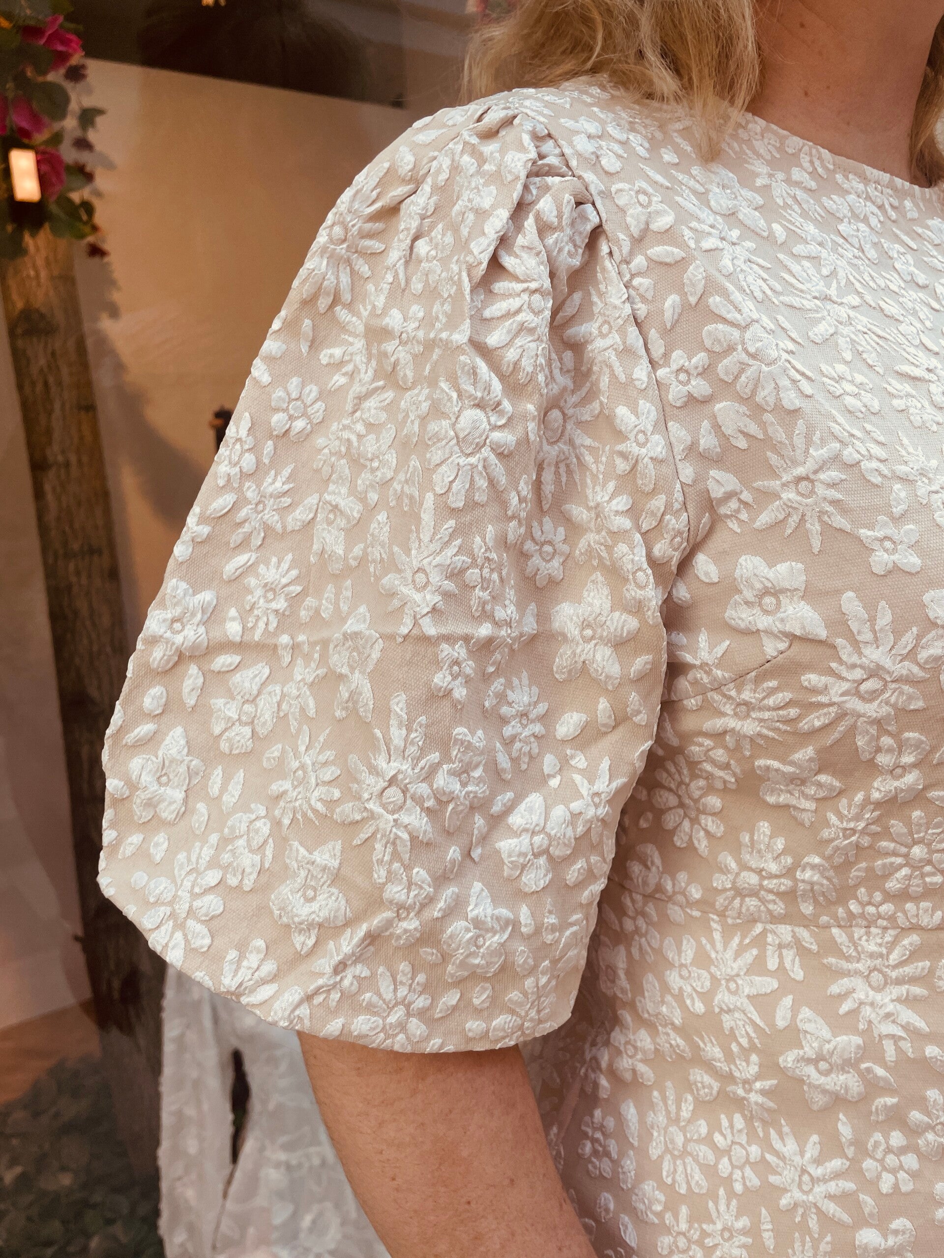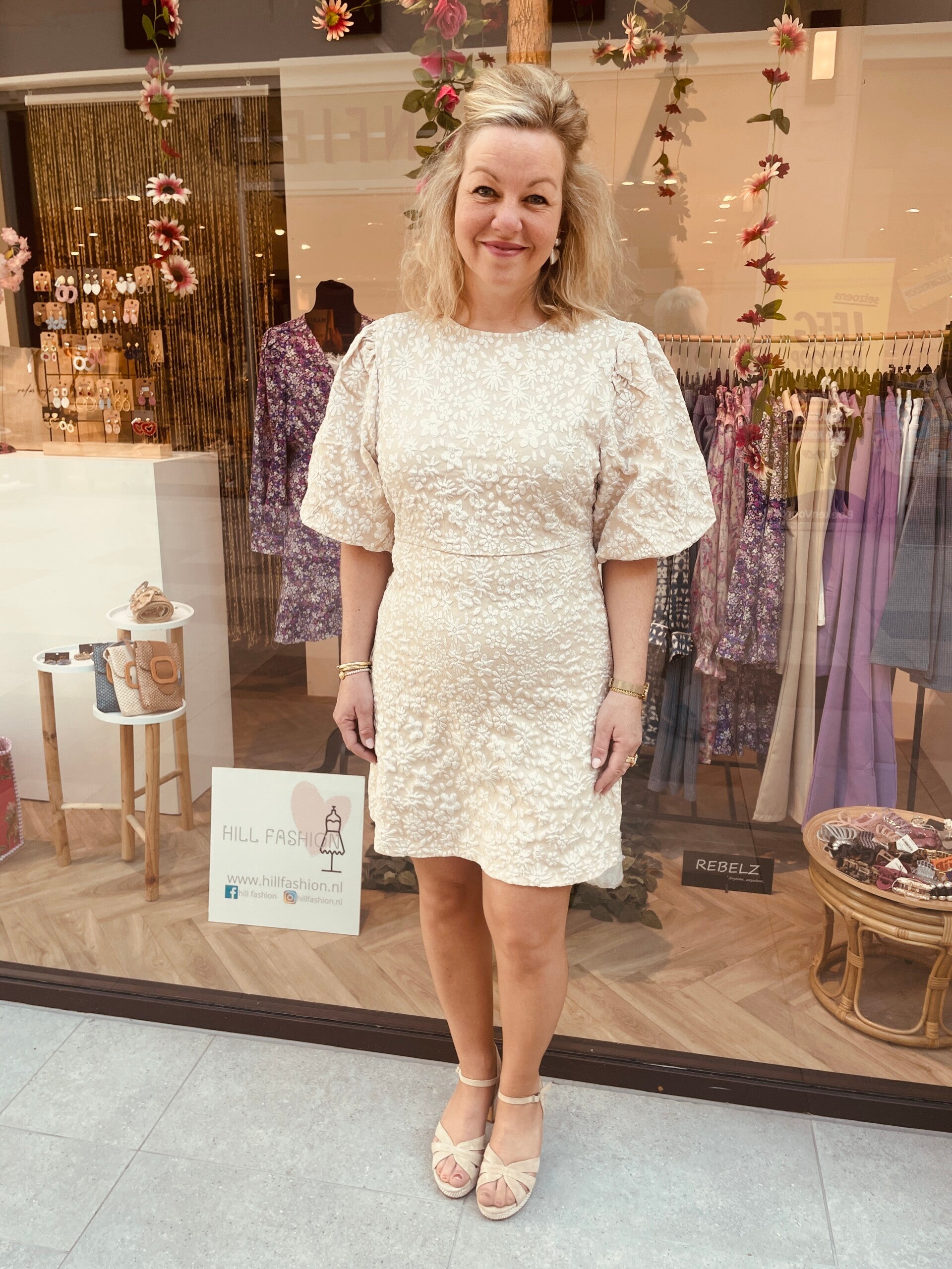 Het jurkje heeft een pofmouw en sluit op de rug met een ritssluiting.