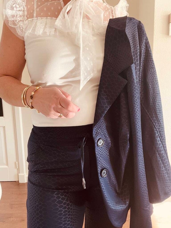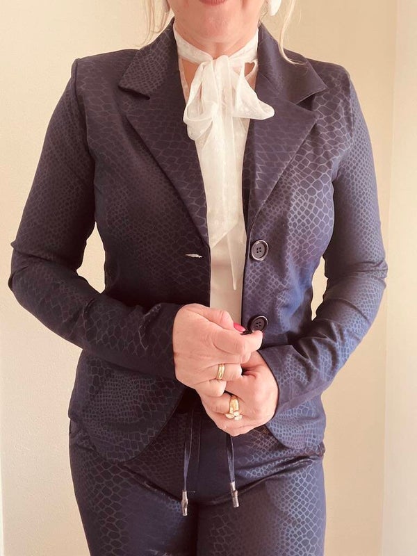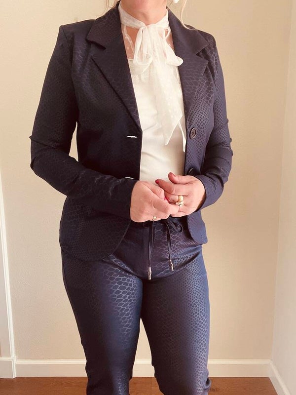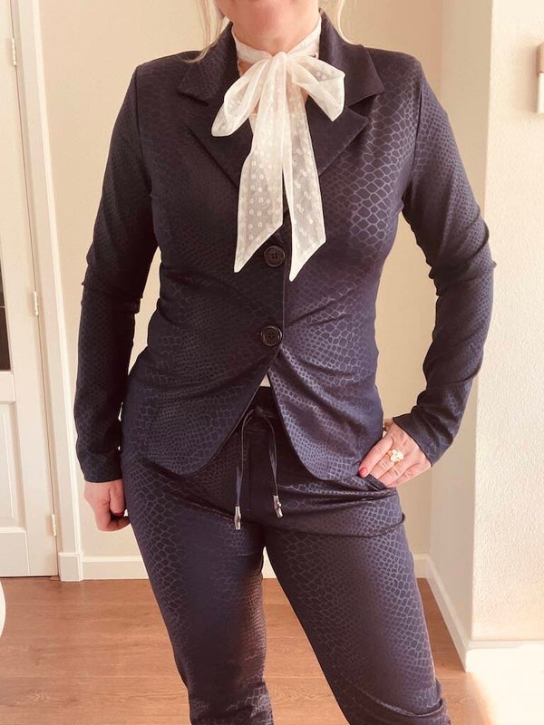 Mooie travelstof broek van het mooie merk Angelle Milan met een leuk printje dat subtiel aanwezig is. Mooi te combineren met Blazer Angelle Milan Noor - Donkerblauw