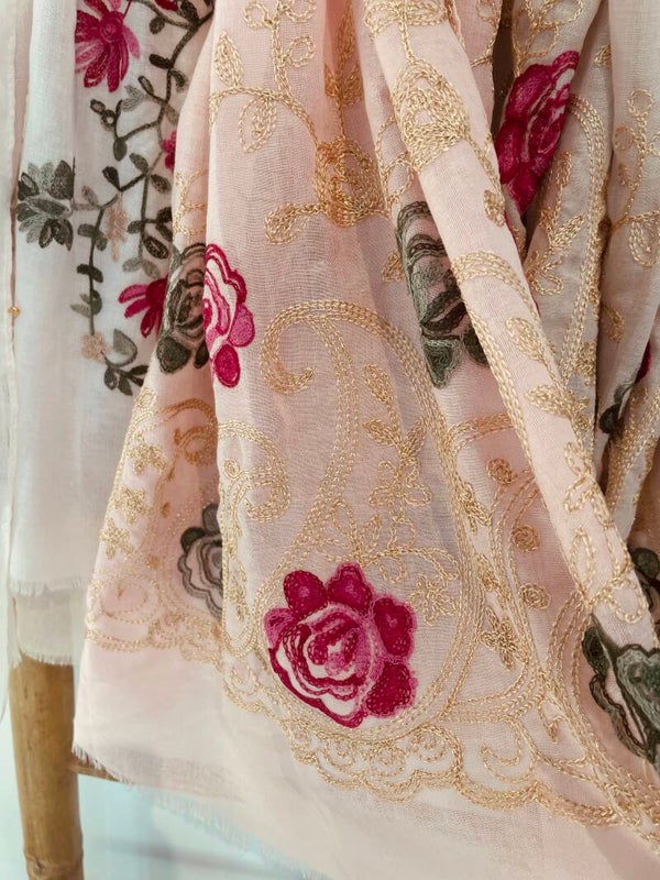 Unieke sjaal met geborduurde bloemen.