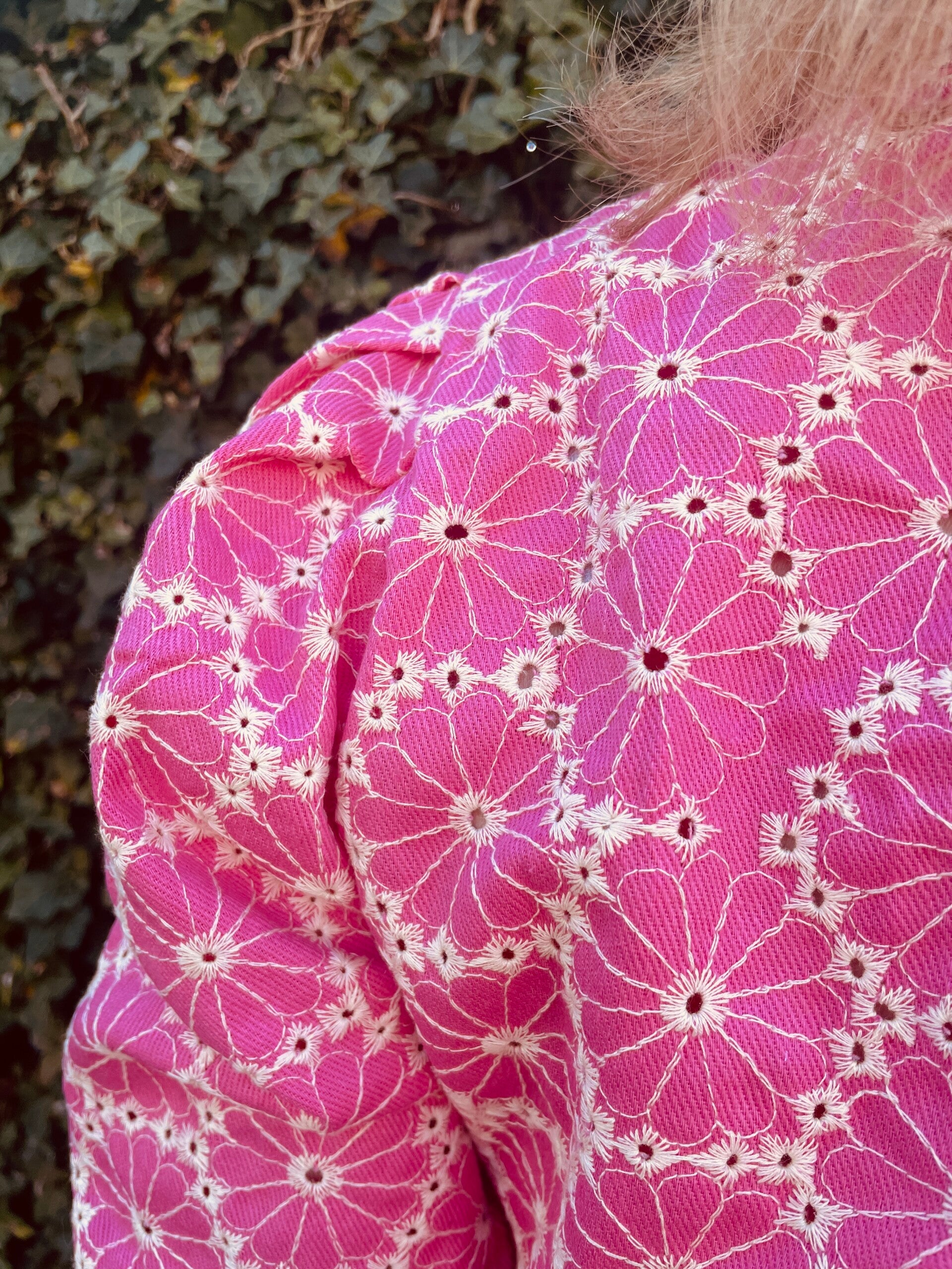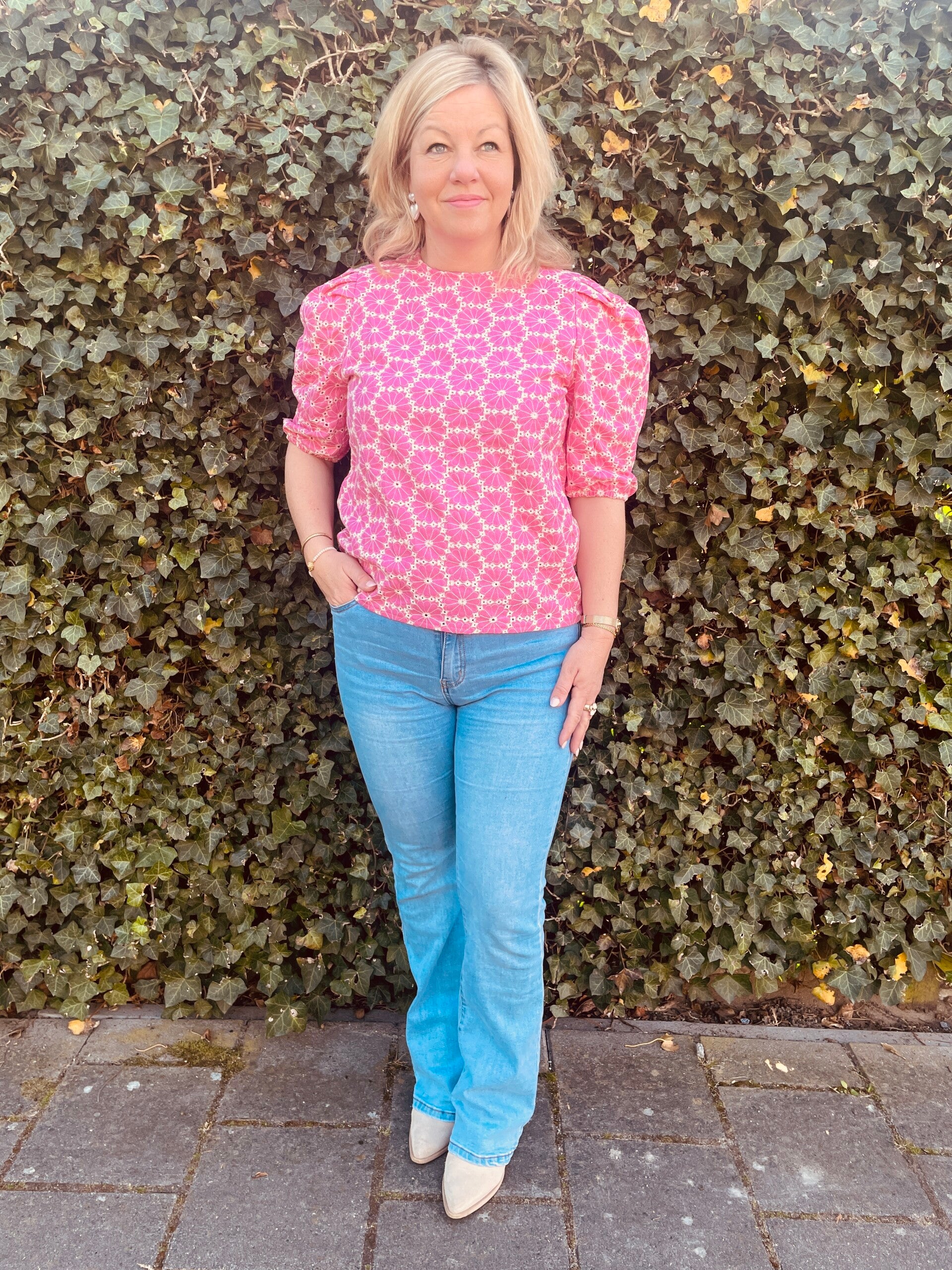 Leuke Azzurro top met pofmouwtjes en een uitgewerkte stof met witte borduursels, van het merk Azzurro.