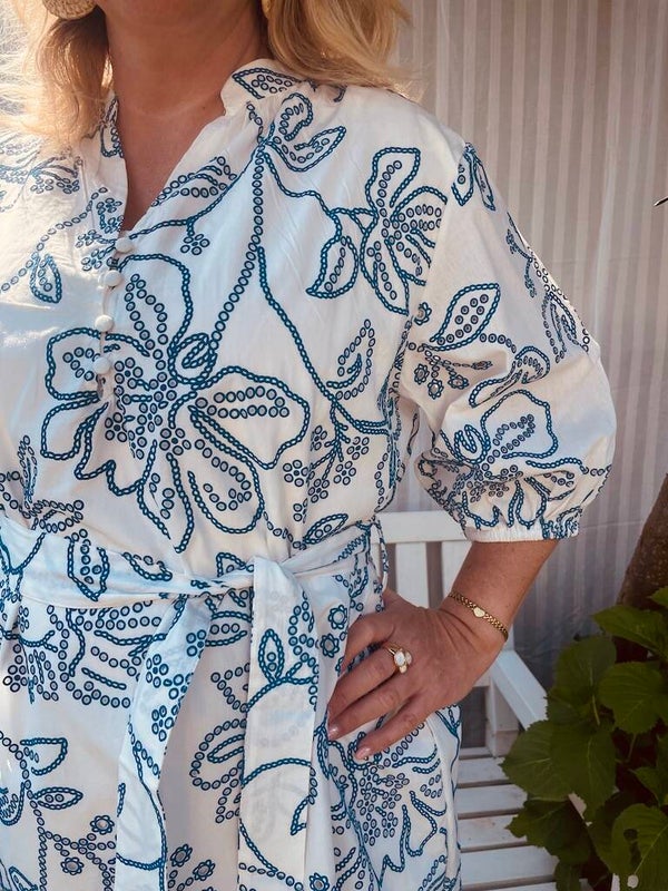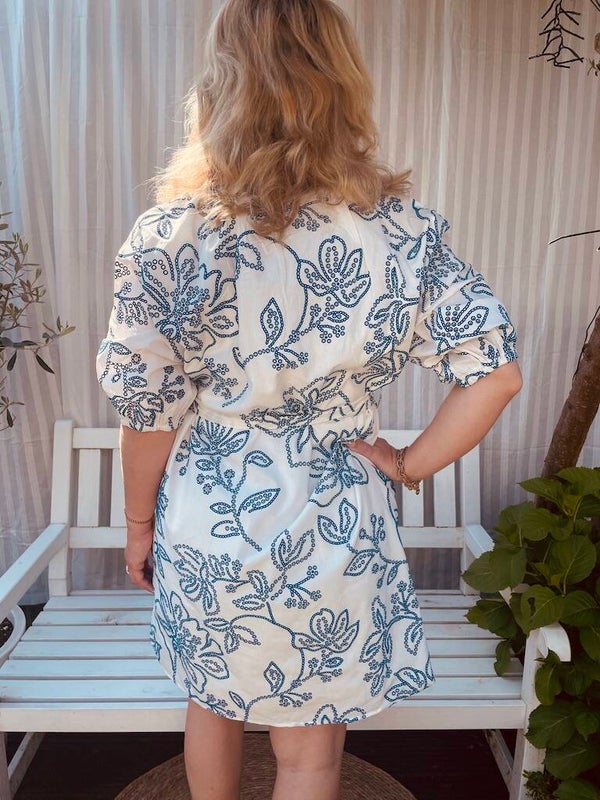 Dit leuke jurkje van Azzurro heeft opengewerkte broderie met blauw afgezet, wat een heel leuk effect geeft. Aan de binnenkant zit een onder jurkje, tegen het doorschijnen. Het jurkje heeft op de voorzijde kleine knoopjes, en elastiek in de mouwtjes. Draag er een mooie set oorbellen bij: Oorbellen Sweet7 Parel - Wit