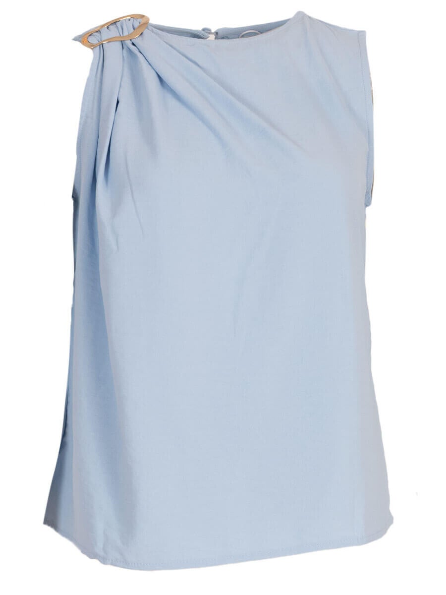 Mouwloze zomertop met leuke accessoire op één schouder.