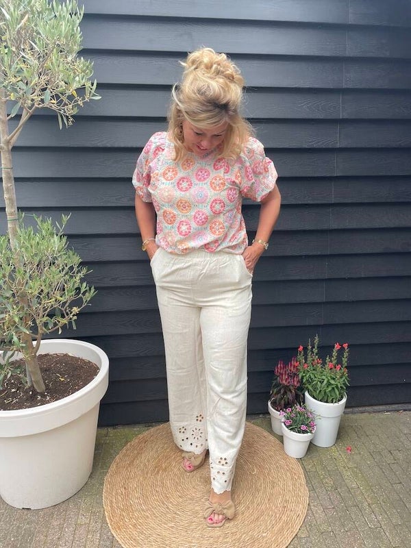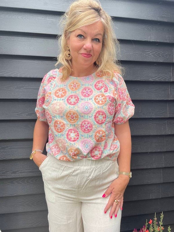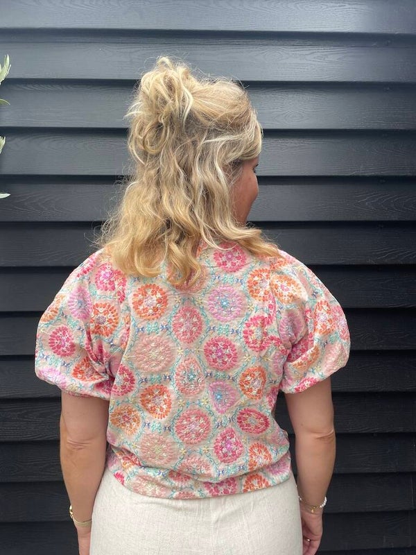 Zomertop met korte mouwen en iets een pofmouwtje.