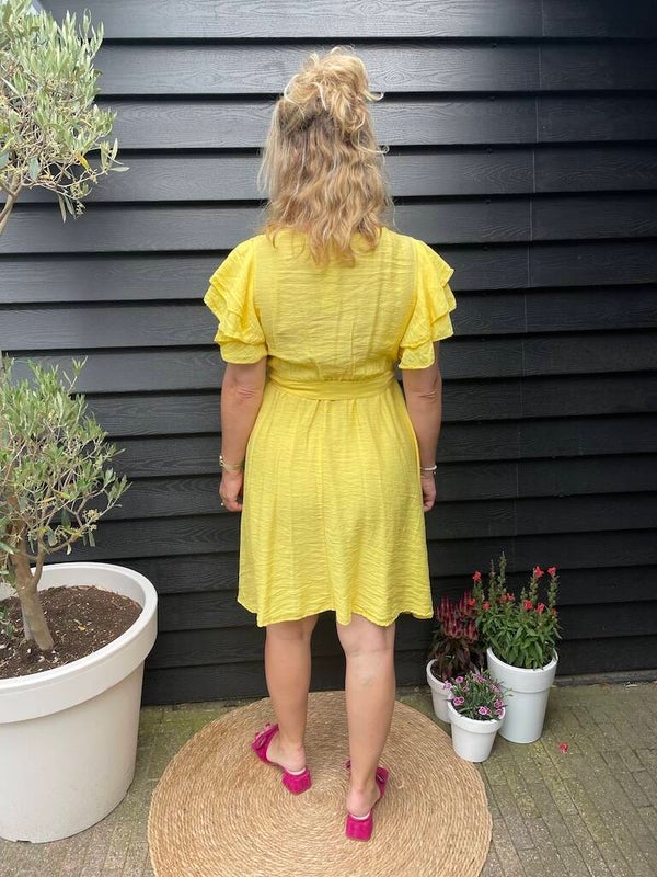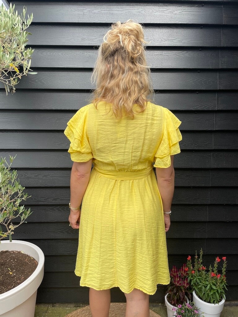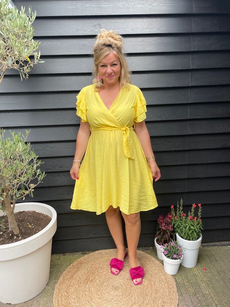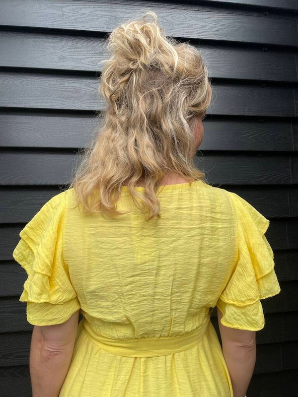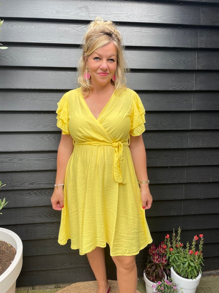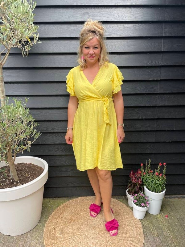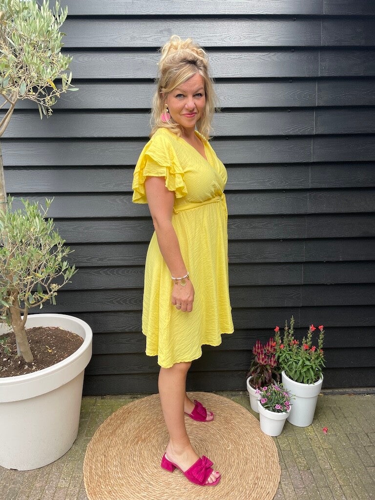 Materiaal: 80% polyester, 20% ViscoseKleur: GeelMaat: One-size t/m maat 40Model: 1.67 lang en heeft maat M/L