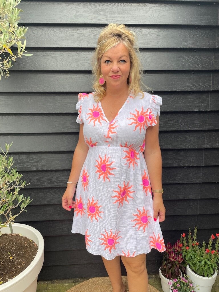 Dan is deze jurk perfect voor jou! De katoenen jurk draagt heerlijk luchtig, en heeft een echte zomerse kleur en print.