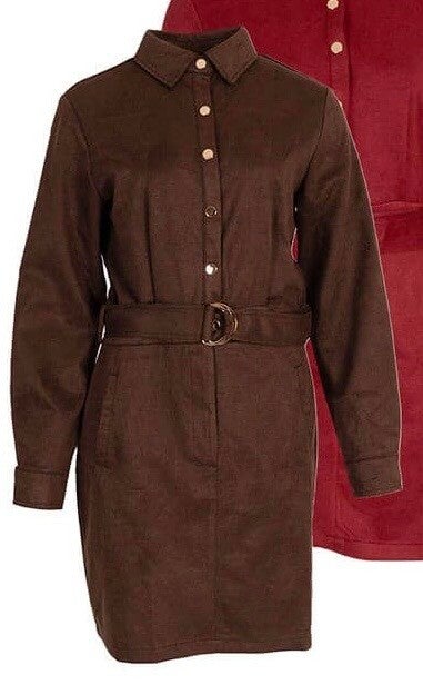 Dit mooie jurkje is gemaakt van een zachte stof in suedelook. De jurk sluit met goudkleurige drukknoopjes en heeft een losse tailleband.