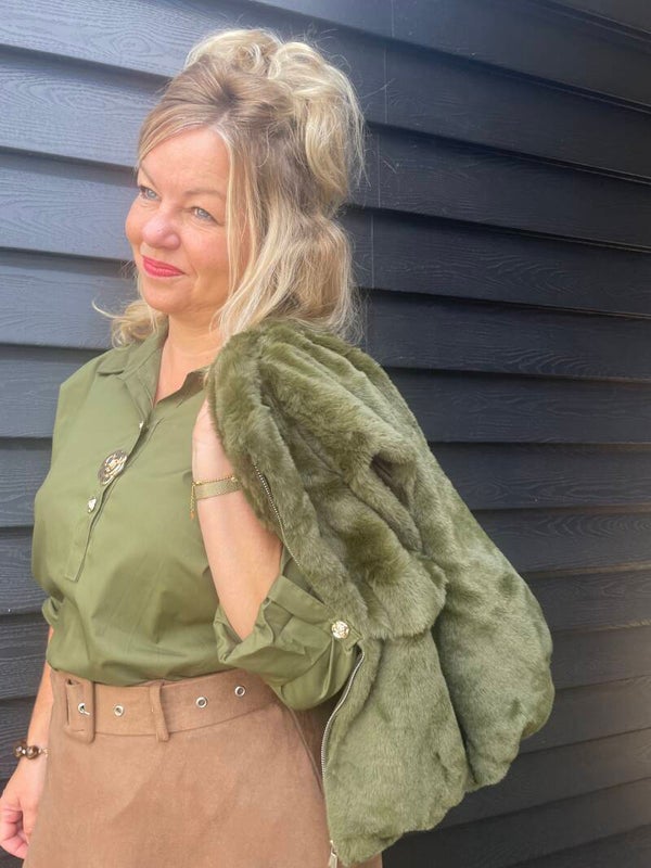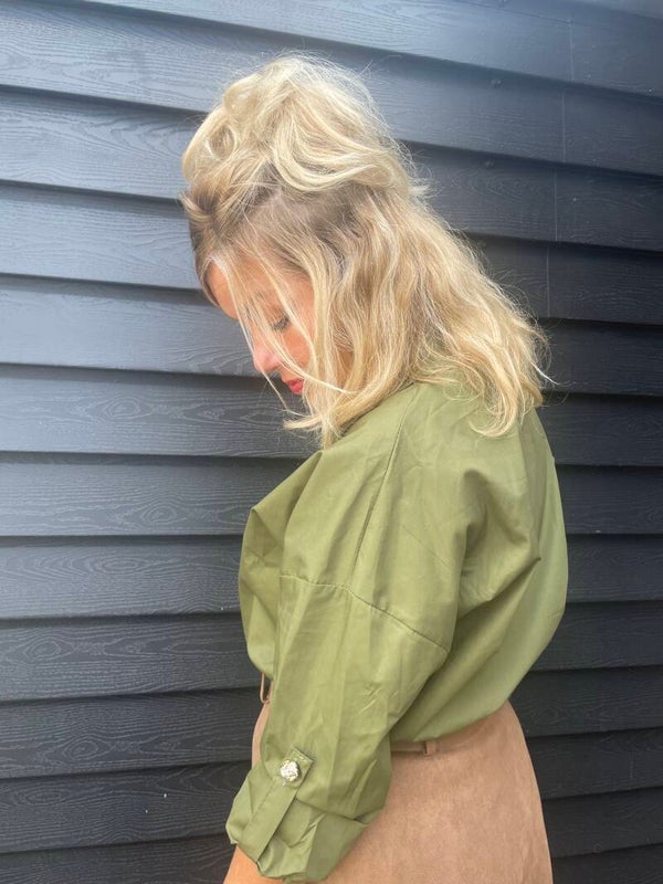 Groen blouse met roosvormige knopen en een roosvormige broche. Het blouse past perfect onder Gilet Bont Noelia - Groen
