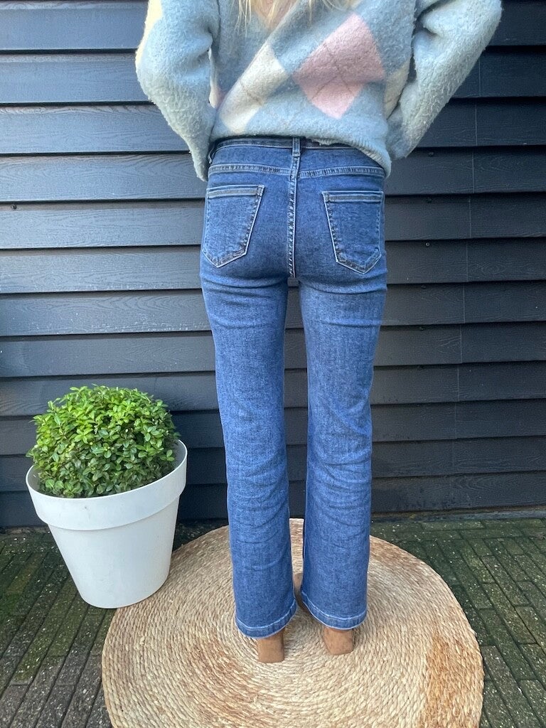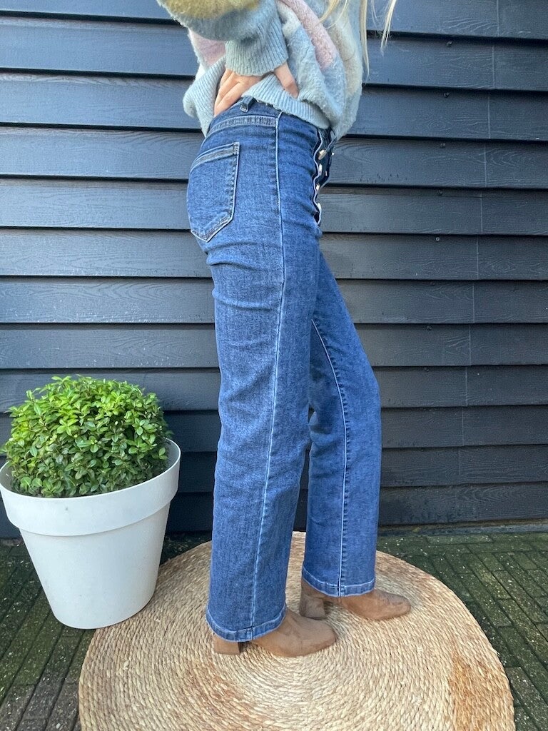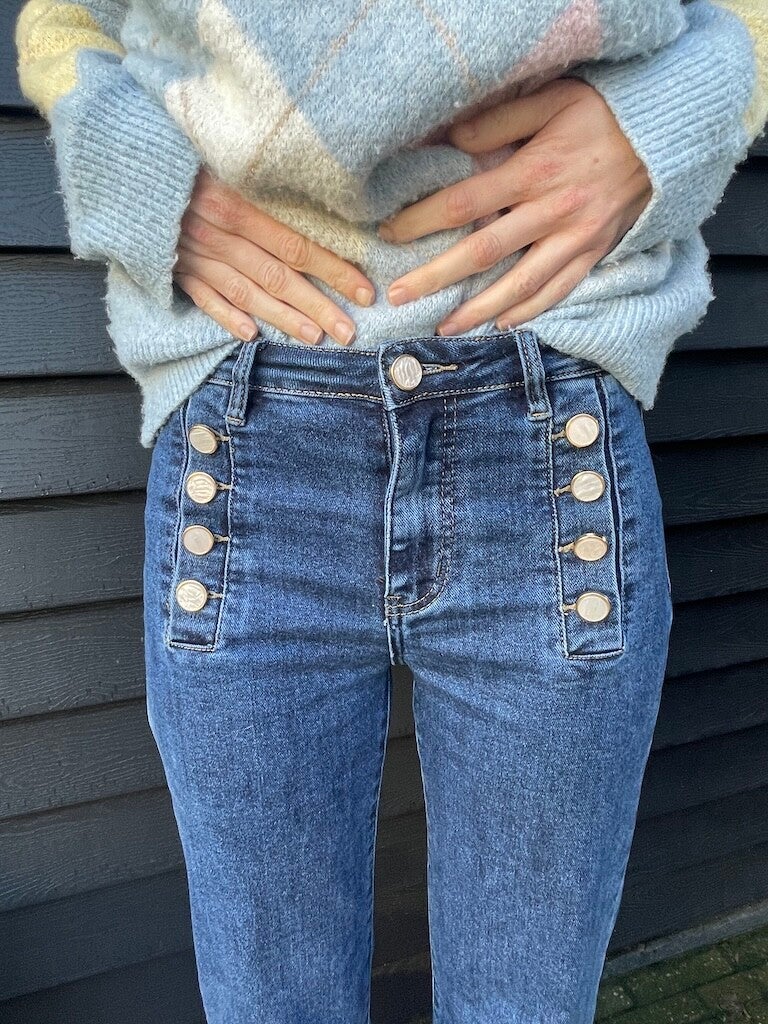 Flared spijkerbroek naar de laatste mode, namelijk met mooie sierknoopjes op de voorkant. De spijkerbroek heeft heerlijke stretch waardoor de broek comfortabel draagt.