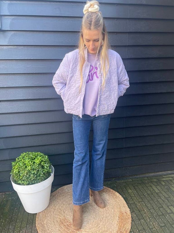 Stylingtip: draag de Sweather Azzurro Paris - Lila eronder met een mooie jeans denk aan Spijkerbroek Foly Rose - Blauw