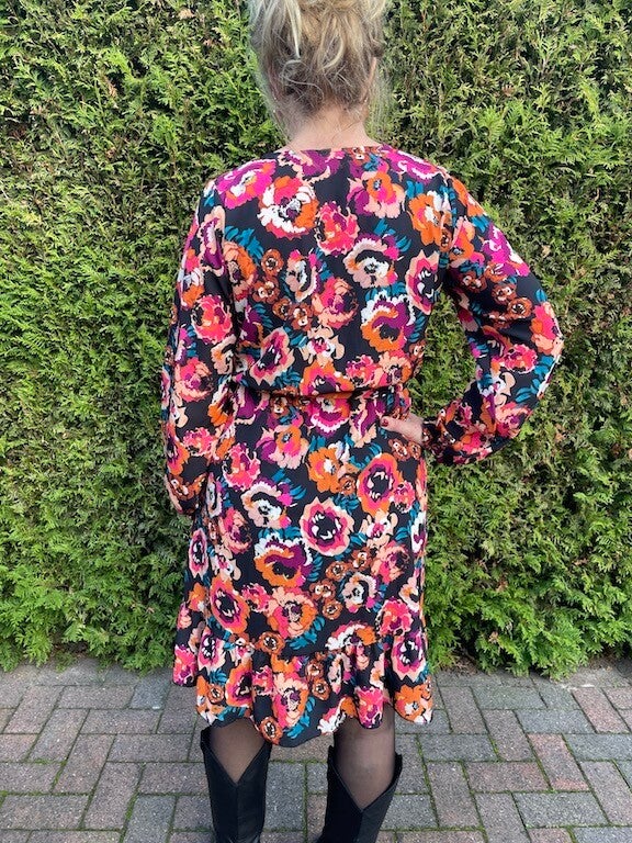 Het jurkje heeft een vrolijke bloemenprint, een v-hals en een leuke roes onderlangs de jurk. De jurk heeft een elastische tailleband waardoor het jurkje mooi valt. De tailleband is leuk af te wisselen met een riem.